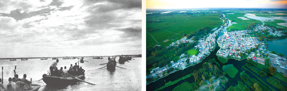 左图为1944年夏季攻势中,号称“雁翎队”的冀中白洋淀水上游击队从冀中文安洼登船向渤海区进发(石少华/摄);右图为如今的白洋淀。