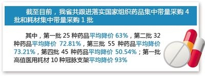 截至目前,我省共跟进落实国家组织药品集中带量采购4批和耗材集中带量采购1批。其中,第一批25种药品平均降价63%,第二批32种药品平均降价72.81%,第三批55种药品平均降价73.21%,第四批45种药品平均降价50.54%;第一批高值医用耗材10种冠脉支架平均降价93%。
