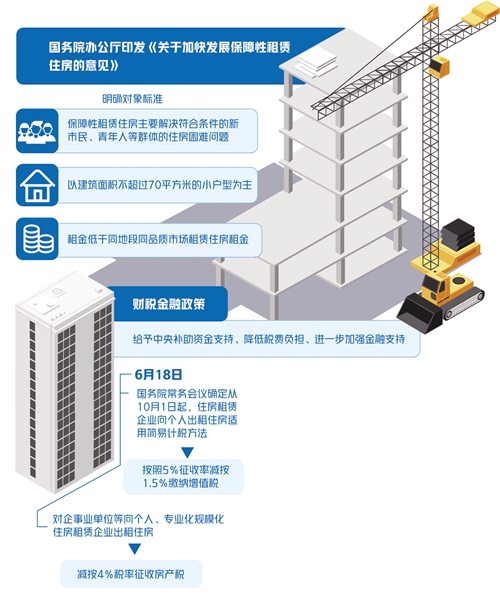 近日,国务院办公厅印发《关于加快发展保障性租赁住房的意见》(以下简称《意见》),明确保障性租赁住房基础制度和支持政策,提出要由政府给予土地、财税、金融等政策支持,要充分发挥市场机制作用,引导多主体投资、多渠道供给。财税、金融政策事关为发展保障性租赁住房解决“钱从哪里来”的问题,《意见》为此明确了一系列“真金白银”的支持保障举措。