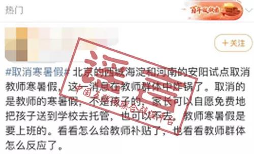 中国互联网联合辟谣平台第一时间向教育部相关部门求证,确认“北京、河南试点取消教师寒暑假”为不实消息。