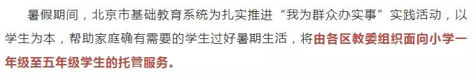 7月2日,北京市教育委员会表示,北京市各区教委将组织面向小学一年级至五年级学生的托管服务。