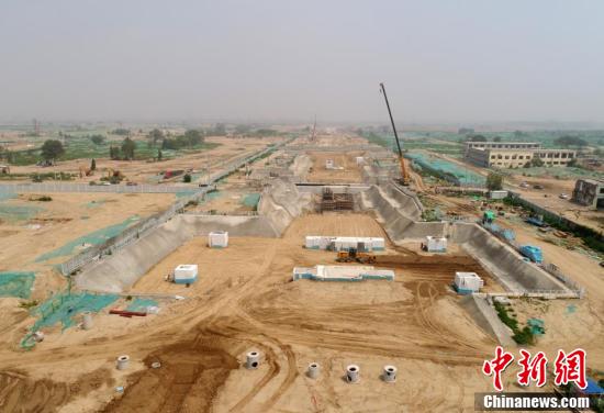 7月7日,记者探访河北雄安新区启动区综合管廊项目。目前,项目主体结构基本完工,主要进行土方回填、排水管网和机电安装工程施工。图为项目土方回填施工现场。中新社记者韩冰 摄