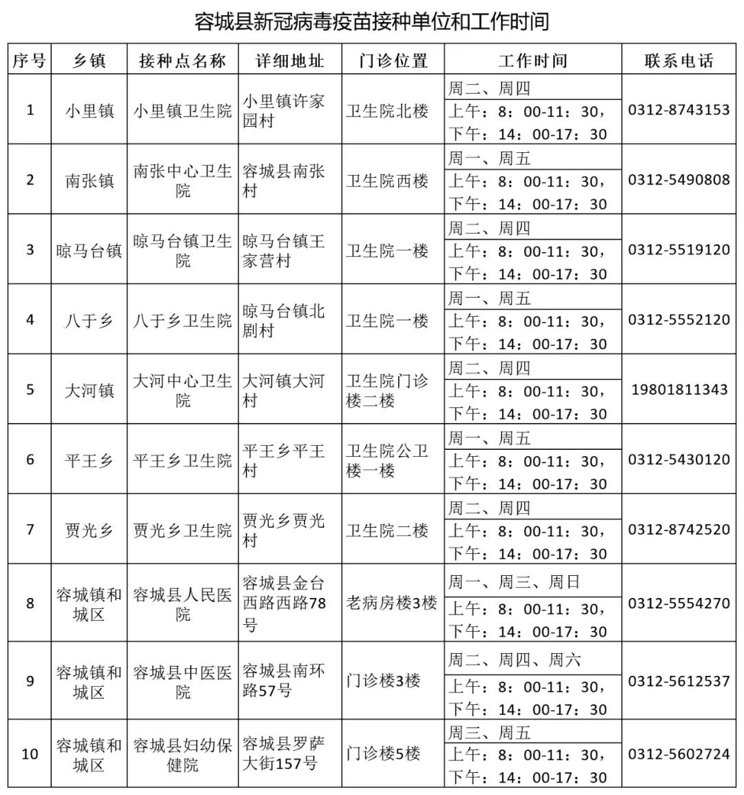 为做好新冠病毒疫苗常态化接种工作,现将容城县新冠病毒疫苗接种单位和工作时间调整如下: