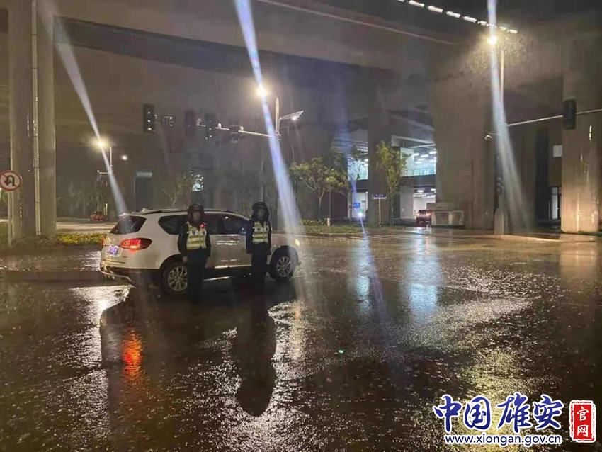 7月11日晚,雄县民警冒雨在辖区主要路口和路段执勤,提醒过往驾驶员减速慢行,注意雨中行车安全。