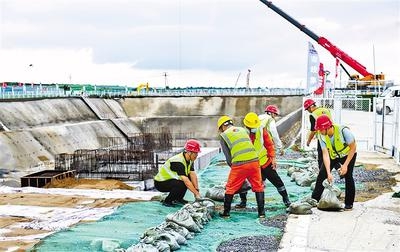 7月12日,施工人员在雄安新区启动区放置沙袋。河北日报记者耿辉 摄