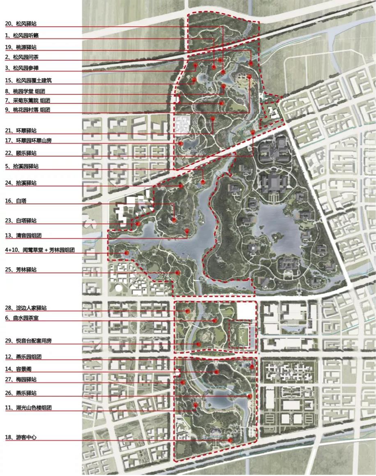 悦容公园位于雄安新区容东片区和辅助配套服务区之间,西至辅助配套区,北临容易线,东至容东片区,南接荣乌高速,是贯穿容城组团南北向城市空间的重要生态景观廊道。公园占地面积约160公顷,建设内容包括绿化栽植、园路系统、公园地形、水景水系、景观建筑、广场铺装、景观小品、城市家具等,重点打造松风园、桃花园、环翠园、白塔园、拾溪园、清音园、芳林园、曲水园、燕乐园等9个园中园。