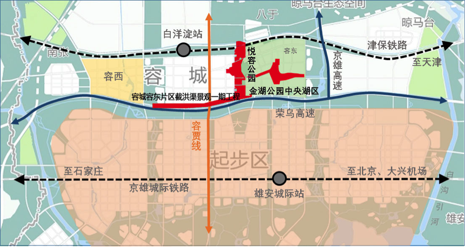容城容东片区截洪渠景观工程一期配套公共空间位置图。