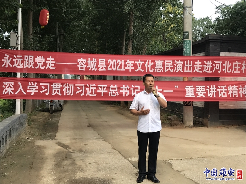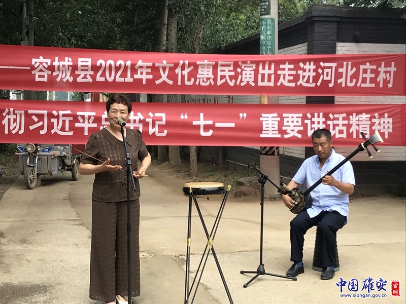 中国雄安官网7月20日电(实习记者李雪娇)近日,由中共容城县委宣传部、容城县文联举办的“永远跟党走”文化惠民演出先后走进小里镇河北庄村、师庄村、王村等5个村,为容城县小里镇村民带来一场场红色文化盛宴。