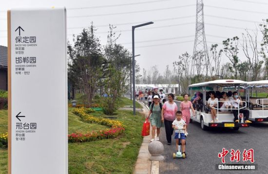 7月21日,雄安郊野公园吸引游客参观游玩。近日,雄安郊野公园试运营开园迎客。公园总面积2.62万亩,拥有14个主题功能各异、“一园一景”的城市展园,是雄安新区“一淀、三带、九片、多廊”生态格局中“九片”之一。图为雄安郊野公园邯郸展园。中新社记者韩冰 摄