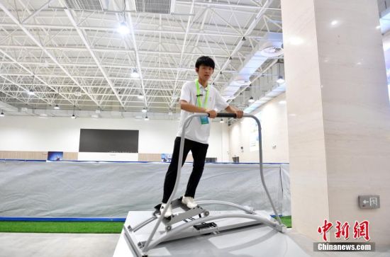 7月21日,雄安郊野公园吸引游客参观游玩。近日,雄安郊野公园试运营开园迎客。公园总面积2.62万亩,拥有14个主题功能各异、“一园一景”的城市展园,是雄安新区“一淀、三带、九片、多廊”生态格局中“九片”之一。图为雄安郊野公园张家口展园内工作人员演示滑雪模拟训练器。中新社记者韩冰 摄
