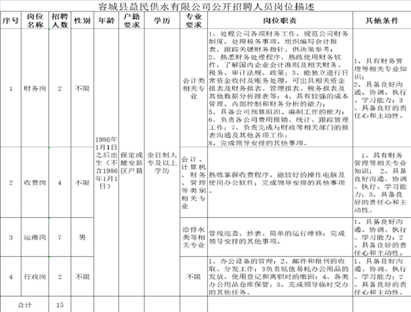 容城县益民供水有限公司是经容城县政府批准,由容城县住房和城乡建设全额出资的国有独资企业,主要经营范围包括:城区供水、公共供水设施及管网维护、水费收缴等。因公司发展需要,现决定面向社会公开招聘以下人员,现公告如下: