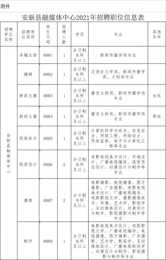 本次共招聘工作人员10名。具体招聘职位及要求详见附件《安新县融媒体中心2021年招聘职位信息表》。