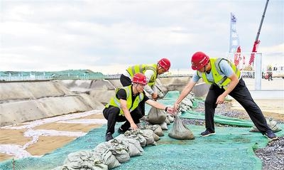 入汛以来,雄安新区严格落实各项防汛备汛措施,扎实做好应急排涝准备,全面排查风险隐患,制定重点在建项目防汛应急预案,确保安全度汛万无一失。图为雄安新区在建项目施工人员放置防汛沙袋。河北日报记者耿辉 摄