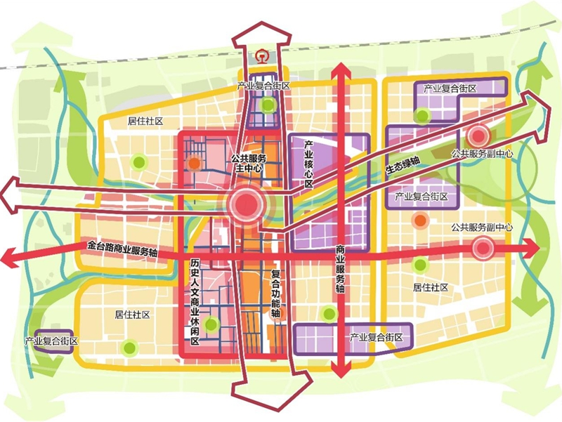 规划在充分衔接周边功能、交通、生境的基础上,挖掘自身特色,融合历史文化要素,形成了“一城双轴”的组团空间结构,构建出“东西向自然灵动,南北向规制有序”的总体空间格局。