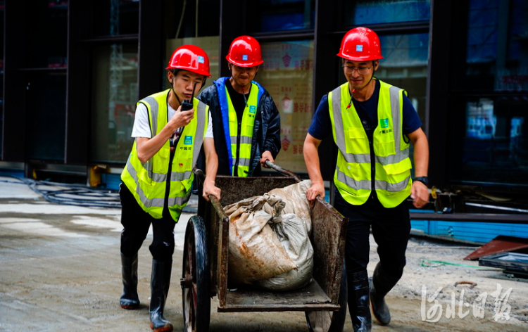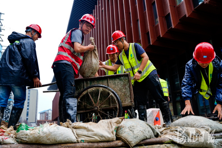2021年7月29日,雄安商务服务中心项目施工人员运送防汛沙袋。河北日报记者耿辉 摄