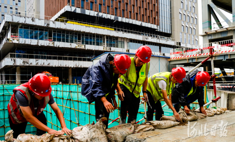 2021年7月29日,雄安商务服务中心项目施工人员在放置防汛沙袋。受台风“烟花”影响,雄安新区出现降雨天气,中建三局雄安商务服务中心会展中心项目全面排查风险隐患,扎实做好应急防汛排涝准备,排查水泵、水带等防汛物资准备情况,安排人员24小时值班,及时排查、消除隐患,确保安全度汛。河北日报记者耿辉 摄