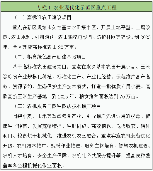 加快高标准农田建设。按照“集中投入、科学规划、按需建设”的模式,在新区规划的占总面积18%的耕地,特别是永久性基本农田,推进集中连片、设施完善、旱涝保收、稳产高产、生态友好、机械化作业高标准农田建设,到2025年高标准农田面积达到20万亩。提升农业机械化水平。积极推广小麦、玉米全程机械化,依托农机专业合作社及联合社等新型服务主体,开展菜单式、托管式、承包式等多种形式服务,推动播种、灌溉、施肥、植保、烘干、贮藏、加工和运输等各个生产环节的机械化应用。到2025年,小麦生产实现全程机械化。