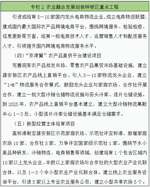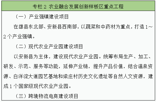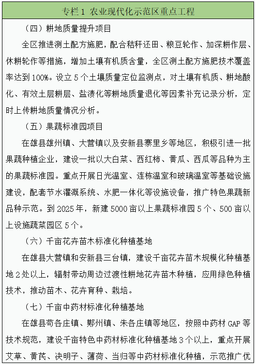 1.雄县。开展高标准农田建设,积极发展粮食及果蔬、中药材、花卉苗木等,重点建设一批高端精品果蔬、中药材、花卉苗木生产示范基地,实现农作物园区化高质高效发展。建设现代农业物流园区,完善农业生产、加工、销售等全产业链。挖掘乡村人文资源,打造休闲观光农业。开展龙头企业、农民专业合作、家庭农场等新型经营主体培育。