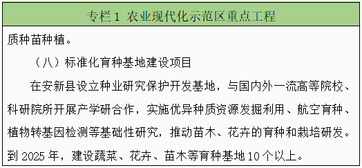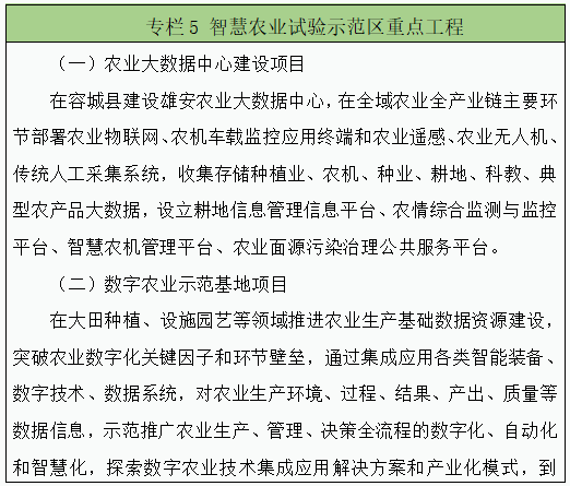 2.容城县。与国内外知名科研机构和高校开展产学研合作,搭建开放式农业科技创新支撑平台。推进农业生产、加工、物流、销售、管理等全过程数字化应用,打造智慧农业示范展示中心。发展以生物育种为主体的现代生物科技农业,建立高标准生物育种试验示范基地。发展个性化、高端精品农业。在全国率先实现农业现代化,将雄安打造成为向国内外展示中国农业的窗口。