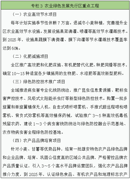 提高农业用水效率。支持和鼓励退减冬小麦等高耗水作物种植,推广小麦节水品种及配套技术。以高标准农田为重点,发展高效节水灌溉,加强渠道防渗、低压管道输水灌溉、喷灌、微灌等节水设施建设,推广水肥一体化设施设备。到2025年,实现小麦节水品种全覆盖,新增高效节水面积1万亩以上。推进化肥减量增效。在继续做好粮食作物测土配方施肥的同时,扩大设施蔬菜等经济作物的应用范围,实施机械施肥、种肥同播、机械深施、适期施肥等技术,引导肥料产品优化升级,大力推广高效新型肥料。到2025年测土配方施肥技术80万亩次以上,主要农作物化肥利用率保持在45%以上。实施农药零增长行动。大力开展农作物病虫害专业化统防统治,集成推广生物防治、物理防治等绿色防控技术模式并建立示范区,推广新型高效植保机械,鼓励和推广使用高效低毒低残留农药。到2025年主要农作物病虫害统防统治覆盖率达到45%以上,绿色防控技术覆盖率达到50%以上。推动秸秆全量利用。推广秸秆粉碎还田、免耕播种和耕翻(深旋、深松)等集成技术,改造提升秸秆机械化还田装备,推进以县为单元的秸秆资源台账建设。到2025年,全区主要农作物秸秆综合利用率达到99%以上。强化农膜和包装废弃物回收及资源化利用。加强地膜科学使用与回收利用试点示范,在农资销售点建立农业废弃物回收站,重点采取地膜机械化捡拾回收,实施地膜减量替代,建立农膜减量使用示范区,因地制宜建立“政府扶持、市场主导、多方回收”的农膜回收体系,全面提升残膜回收与资源化利用水平。到2025年,农膜回收率达到90%以上。