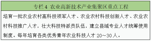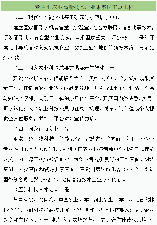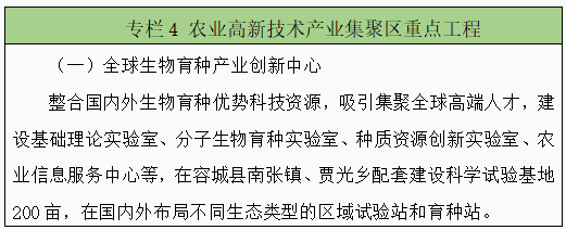 坚持以科技创新为核心,集聚一批国内外科研院所、高校、科技型企业,吸纳一批高端人才、领军人才,推动产学研深度融合,打造国家农业科技人才孵化平台。聚焦国家粮食安全战略,发展以生物育种为主体的现代生物科技农业,围绕智能装备、农业节水、生态修复等重点领域,承接和实施一批国家科技攻关项目,获得一批前沿性成果,打造世界级农业科技研发平台。打造农业科技成果转化的全要素、全过程、全产业链公共服务平台,推进成果孵化转移、科技成果交易,推动载体、人才、金融等科创要素聚集,探索建立知识产权保护与科技要素参与分配的机制,搭建好农业科技与生产之间的畅通桥梁。