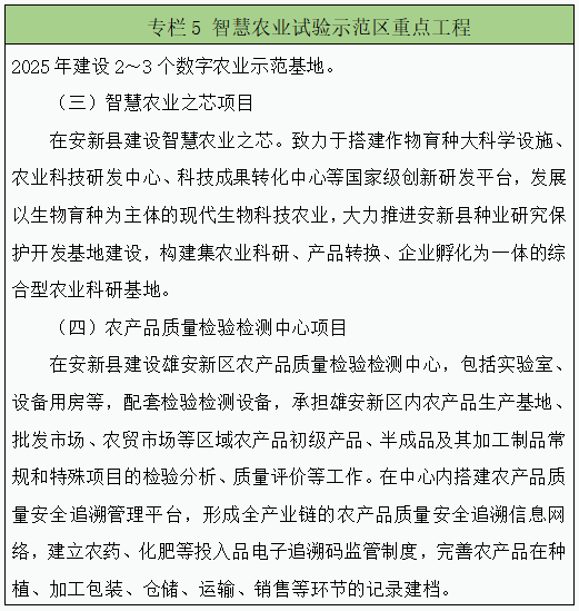 建设一批绿色高产基地。以安新县和雄县21万亩基本农田为重点,建设小麦、玉米等粮食产业绿色高产基地,稳定非主产区粮食种植面积。大力发展优质小麦、高产玉米等优质食味品种,组织开展粮食绿色高产攻关,加强新品种、新技术、新模式示范应用,稳步提升粮食产能。加强应急保供、质量监管等粮食安全保障能力建设,建设一批全国一流特色精品粮食产业聚集区、绿色高效粮食全产业链示范区。发展标准化设施园区。以雄安新区农作物主产区为核心,大力发展果菜类和叶菜类等生鲜果蔬,建设一批集温室智能调控、省力化作业、精准对靶施药、生产智能化管理等功能于一体的设施蔬菜产业基地,加大高品质、高产量优先果蔬品种生产规模。到2025年,全区设施蔬菜种植面积占比达到25%以上。开展精准覆盖果菜、花卉、苗木生长全过程的温室智能化精细生产技术与装备研发,扶持建设一批成套设备试验推广基地。引进新材料、智能制造、5G通讯、AI等先进智能化技术,实现耕、播、收、灌溉、环控五环节在线实时监测。
