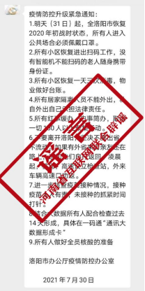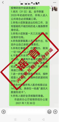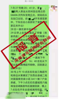 (三)8月2日,南阳市镇平县一网民在微信群内发布“疫情防控升级紧急通知明天(31日),不要离开本市,坚决不要出省,不流动”等涉疫情信息。经核实,该信息不实。