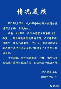 7月30日,洛阳市伊川县葛寨乡黄某坡(男,45岁),擅自编造涉疫情不实信息,并发布到微信群中,造成不良影响。