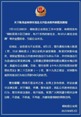 桐柏县公安局网安大队和城郊派出所立即溯本追源对陈某进行询问。8月1日,桐柏县公安机关依法对其散布谣言的违法行为处以罚款500元的处罚。