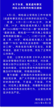(二)8月1日,南阳市桐柏县孙某在微信群发消息称:“最新消息,桐柏县****昨天晚上检查出来两例新冠确认……”。骆某在微信群发消息称:“桐柏确诊三例”。两条信息均属不实言论,系散布谣言,扰乱了公共秩序。