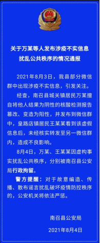(四)8月3日,南阳市南召县城关镇居民万某擅自将他人结果为阴性的核酸检测报告篡改、变造为阳性,并发布到微信群中,皇路店镇居民王某某看到该虚假信息后,未经核实转发至另一微信群内,造成不良影响。8月4日,万某、王某某因虚构事实扰乱公共秩序,分别被南召县公安局行政拘留。