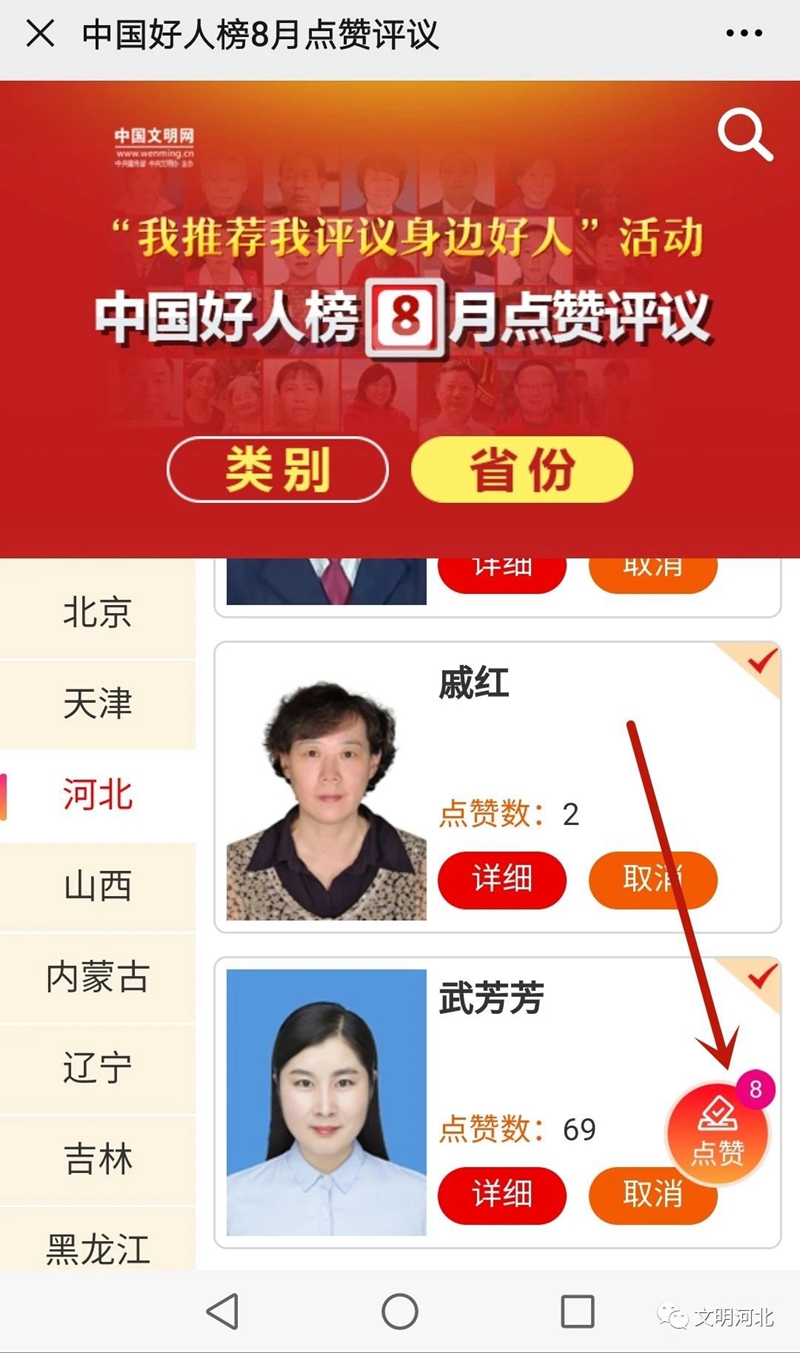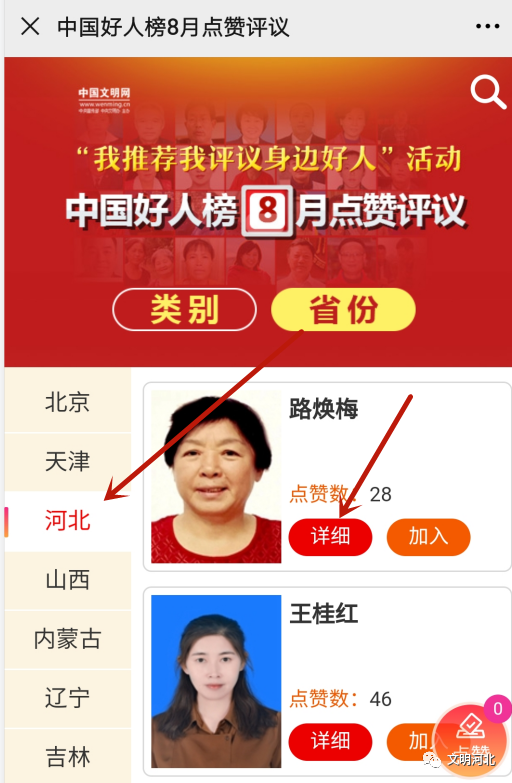 2.点击选择河北省,点击人物“详细”,浏览好人事迹。