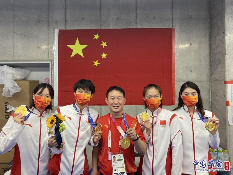 2020东京奥运会女子4×200米自由泳接力项目夺冠后,杨浚瑄(左二)、汤慕涵、张雨霏、李冰洁与教练王爱民合影。中国雄安官网发