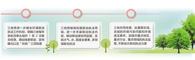 今年,三地将进一步健全环境联动执法工作机制,明确三地每年各轮流牵头组织1至2次联合检查,增加线索移送、宣传曝光以及“吹哨”三项制度,其中,“吹哨”制度明确要求,对于交界处发现的重大环境违法行为,一地发现启动“吹哨”制度,另外两地及时“报到”,协同开展查处工作。