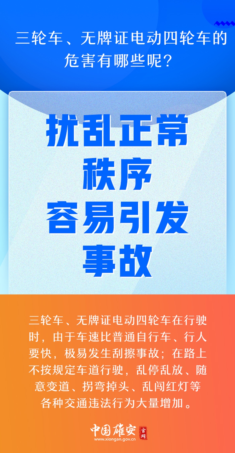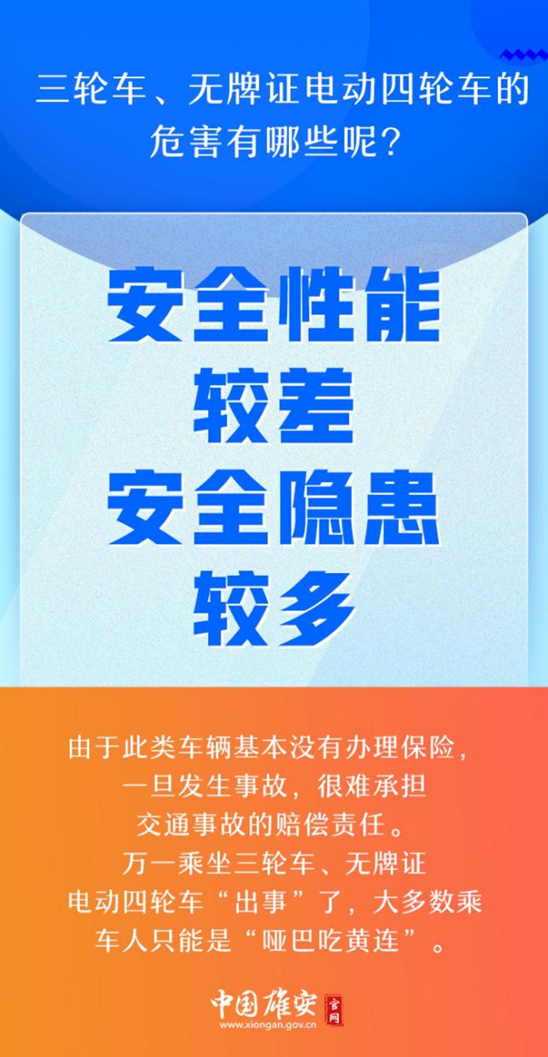 目前,雄安新区三县交警大队已开展规范以电动三轮、四轮车为主的交通安全整治行动,并通过张贴宣传海报、悬挂安全提示条幅、发放交通安全宣传资料、村内大喇叭广播等形式,向群众讲解三轮车、无牌证电动四轮车使用不当的危害性;大力宣传违规驾乘非机动车带来的严重危害,劝导广大驾驶员杜绝闯红灯、违规载人等违反交通法规行为;提醒群众拒绝乘坐非法营运车辆,自觉抵制交通陋习,养成安全文明的出行习惯,提高交通安全意识,确保自己和他人的生命财产安全,进一步打造文明、安全、和谐的道路交通环境。
