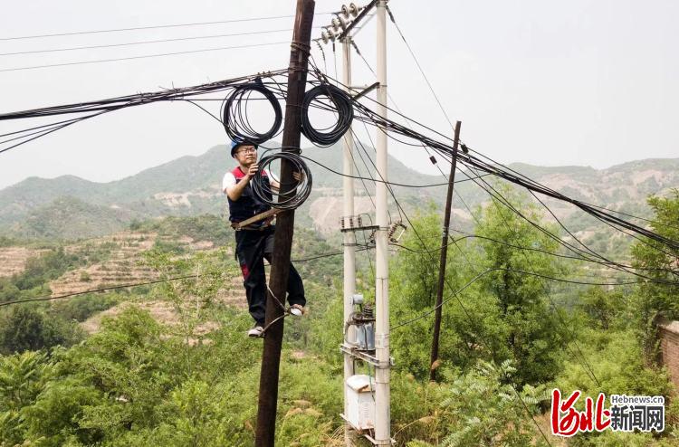 图为邢台移动工程建设人员在临城县鸡亮村架设光纤宽带。通讯员刘虎 摄