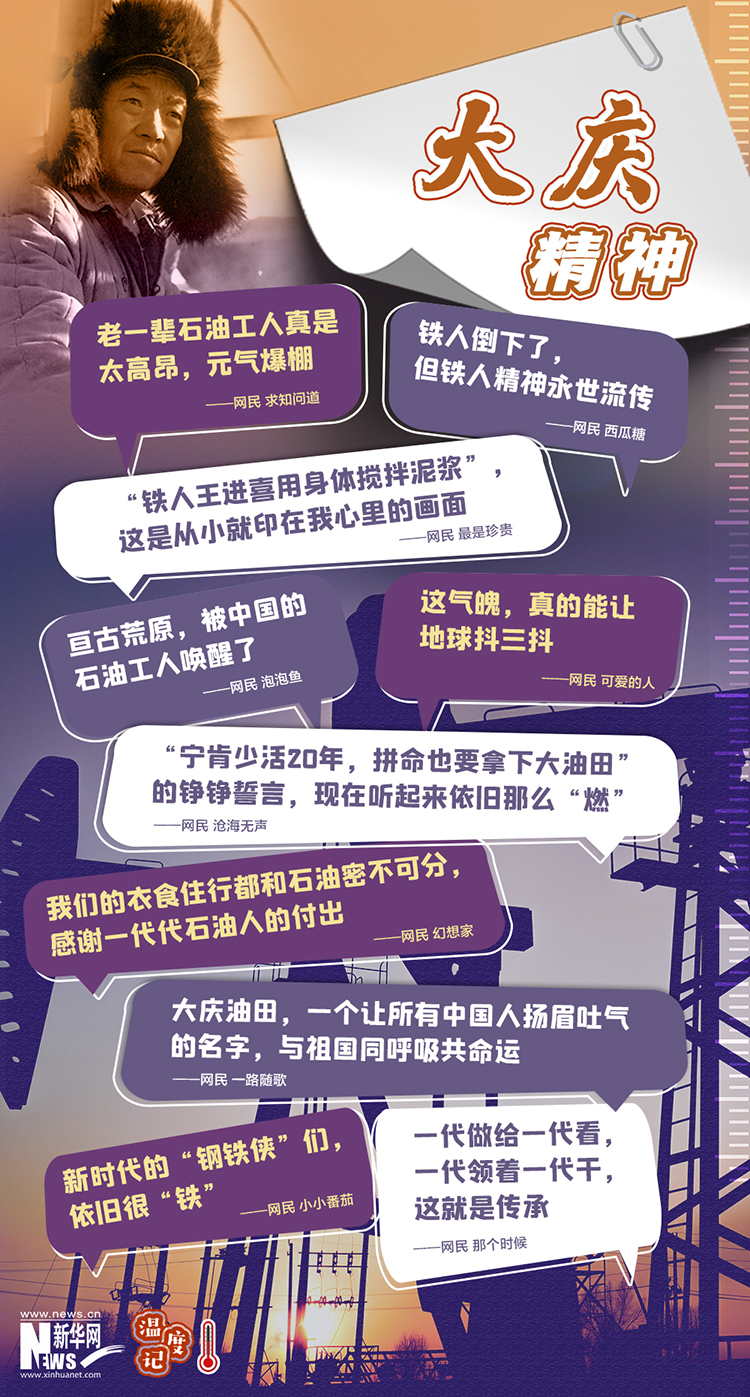 岁月更迭,精神的火炬在一代代大庆人手中传递、擎起。60多年来,大庆人高唱着“我为祖国献石油”的主旋律,在这片黑土地上艰苦创业、接续创奇,持续为中国这艘经济巨轮提供强劲的前进动力。正如网民在社交平台上留言,“一代做给一代看,一代领着一代干”“新时代的‘钢铁侠’们,依旧很‘铁’”,精神的力量在传承中发展,精神的光芒在传承中绽放。(文字:冯文雅 海报设计:王晔)