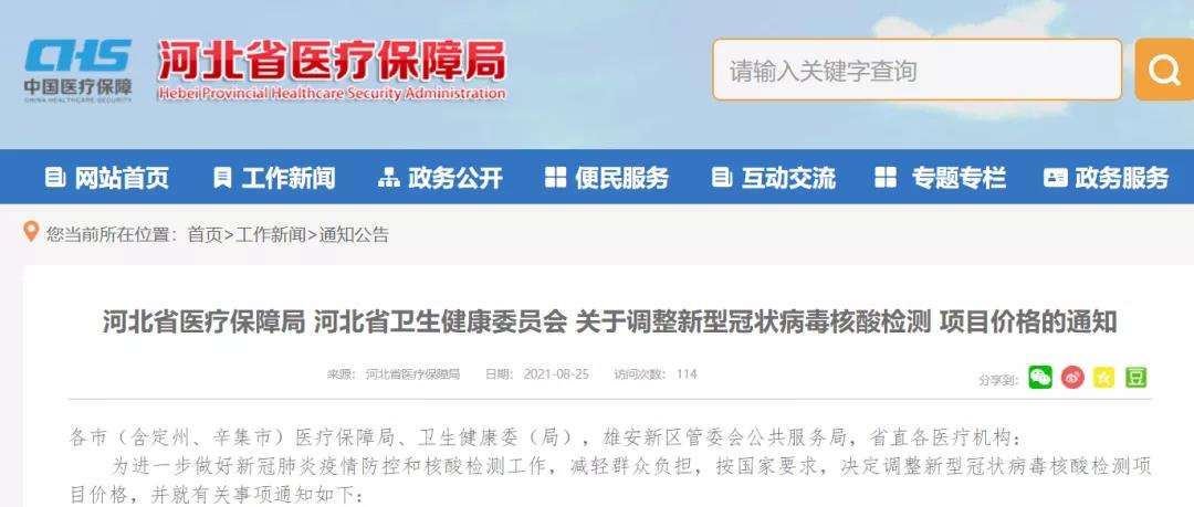 为进一步做好新冠肺炎疫情防控和核酸检测工作,减轻群众负担,按国家要求,8月24日,河北省医疗保障局联合省卫生健康委员会共同发布《关于调整新型冠状病毒核酸检测项目价格的通知》。↓↓↓