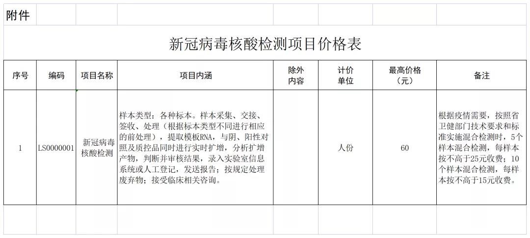 一、将新型冠状病毒核酸检测项目的最高限价由每人份80元调整为60元;10个样本混合检测,最高限价由每样本20元调整为15元;5个样本混合检测,最高限价由每样本30元调整为25元(详见附件)。