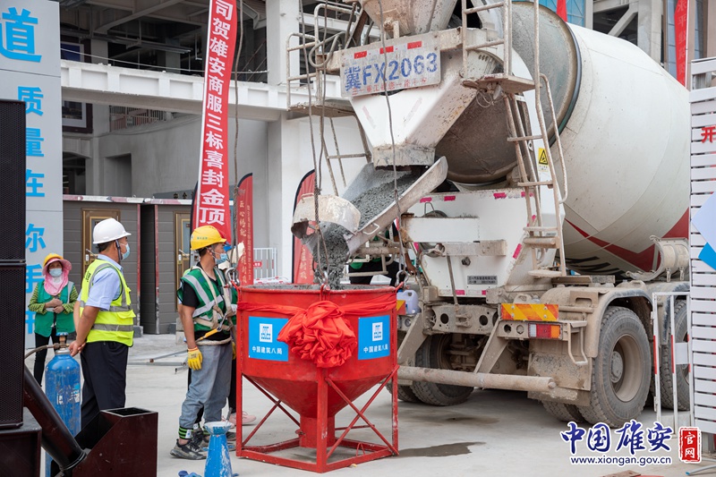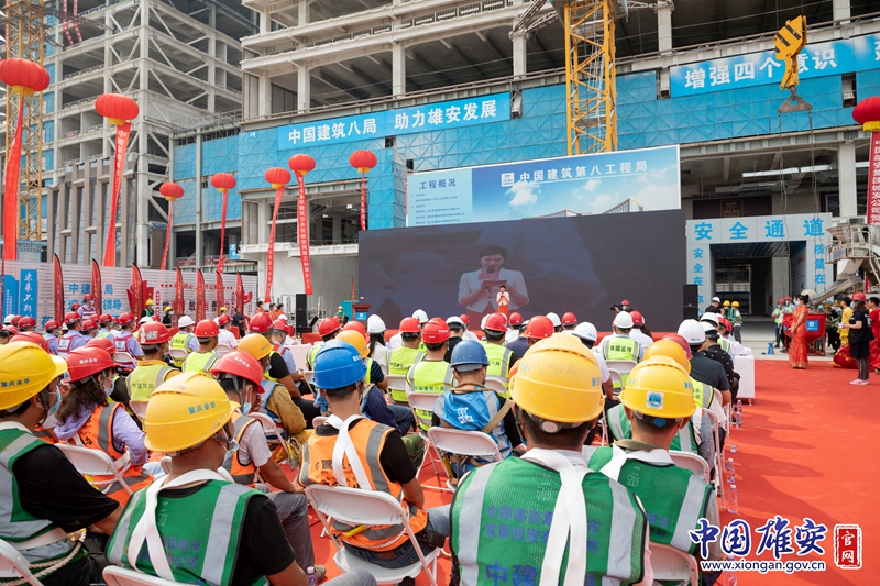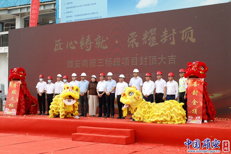 8月30日,随着最后一方混凝土浇筑完成,雄安商务服务中心三标段项目主体结构实现全面封顶。图为封顶仪式现场。中国雄安官网毛鹤然 摄