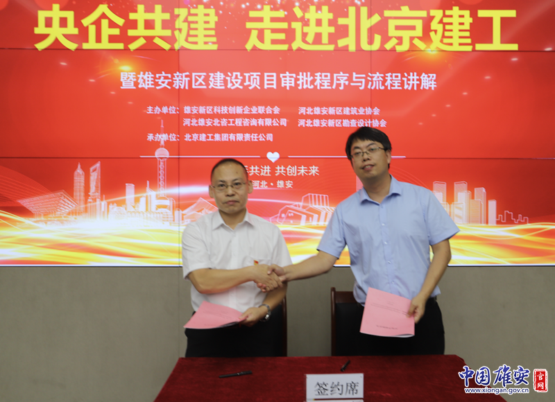 会上,雄安科企联党支部书记操道访与北京建工五建集团副总经理、雄安宣武医院项目经理赵育华就双方今后全面推进党组织建设、搭建党建共建平台事宜,签署《党建共建协议书》。