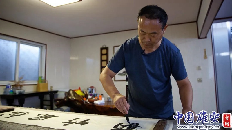桌上茶香袅袅,一支禅香缥缈,各式竹簧作品装点着王乐修的家,安静又诗意。其中一张铺陈着笔墨纸砚的大桌子尤其醒目。“我平时在设计图案、制作竹刻之余,也会抽空写写字、画个画,书画雕刻都是不分家的。”王乐修笑着说。实习生赵伟彤 摄