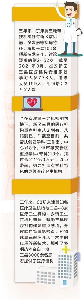 三年来,京津冀三地帮扶机构针对新区常见病、多发病等疾病特征,积极开展100余项新技术合作,讨论疑难病例2452次。依托京津冀优质医疗卫生资源,雄安新区三县医疗机构通过选派骨干人员进修、专家带教、专业人员培训等方式持续深化人才培养能力。截至2021年8月,安排跟随学习人员776人,进修人员159人,组织培训3万余人次。对口帮扶提升了新区三县本土医务人员的医疗卫生服务能力和服务水平,医患关系得到了明显改善。