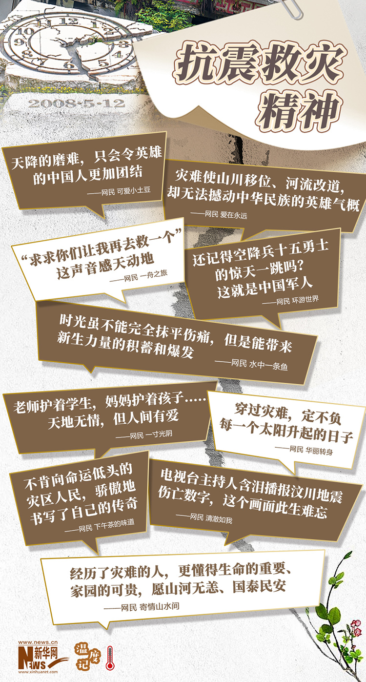 没有一道沟坎,不会被逾越。从灾难中走过来的人们,更加懂得自强不息、精诚团结,正如社交平台上的网民留言,“穿过灾难,定不负每一个太阳升起的日子”“时光虽不能完全抹平伤痛,但是能带来新生力量的积蓄和爆发”。伟大的精神力量,在每一个人的手中铸造,又在每一个人的心中传递,挺立起一个伟大的中国。(文字:冯文雅 海报设计:王晔)