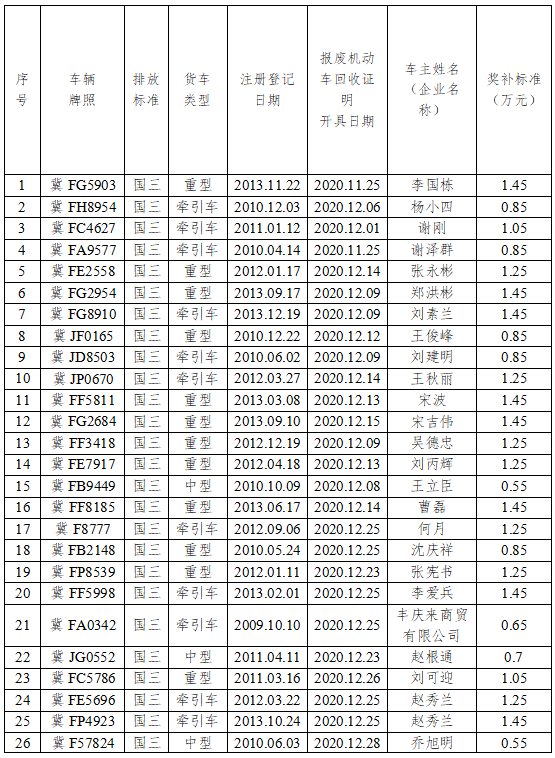 4.第一批公示车主徐艳华的冀FF8196货车注册日期由2012.06.17调整为2013.06.17,奖补标准由1.25万元调整为1.45万元。