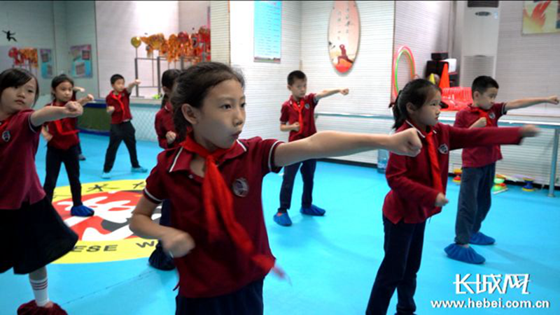石家庄外国语教育集团小学部的学生们在课后服务时间体验武术训练。长城网记者 武新杰 摄
