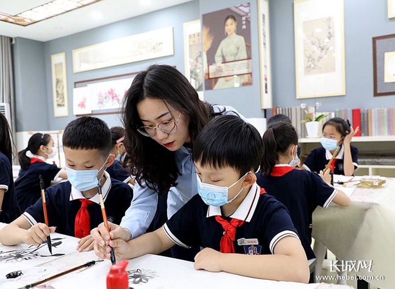 “孩子们注意握笔的姿势,手腕可以放松一些。”每天下午放学后,石家庄外国语教育集团国画老师张丽丛都会带着“国画兴趣小组”的孩子们进行国画练笔。