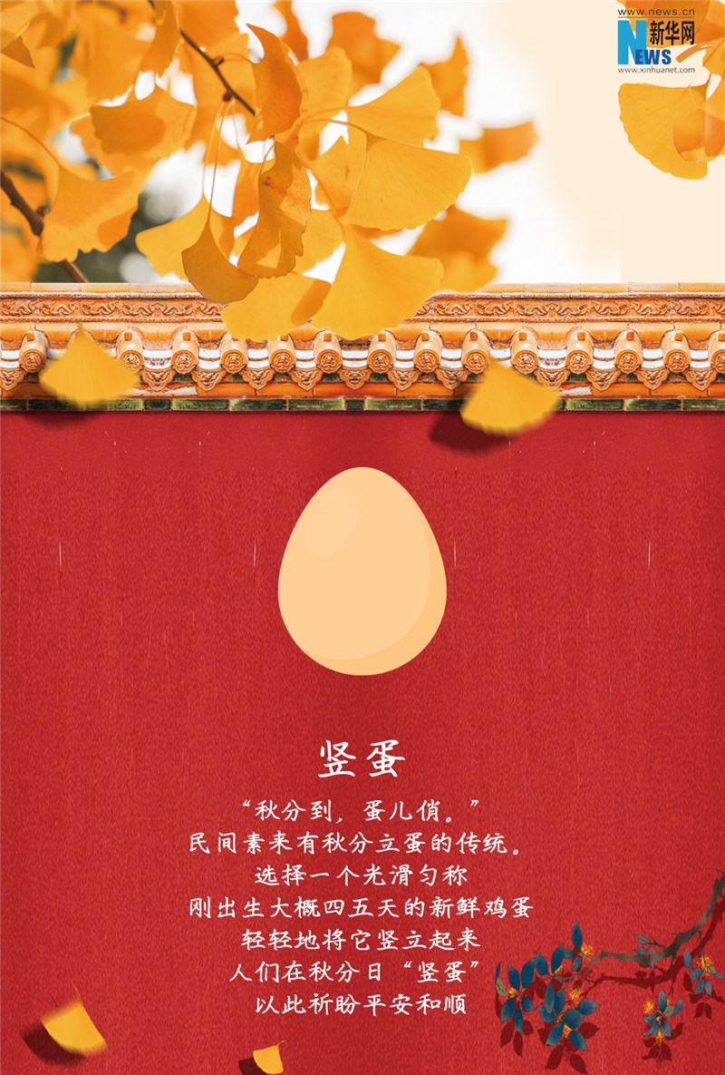 秋分,是二十四节气之第十六个节气,“分”即为“平分”“半”的意思,除了指昼夜平分外,还有一层意思是平分了秋季,自古也形成了丰富多彩的节气习俗。竖鸡蛋、粘雀嘴、拜月、放纸鸢……秋分不仅充满季节特征,也充满着生活情趣。一起看看吧!(庞雪汀 刘逸凡)