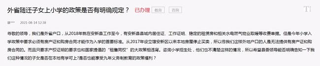 秋季学期开学前,网友“雄安新人”通过人民网“领导留言板”《雄安新区为民办实事微心愿征集》专页,给安新县委书记留言,希望能解决孩子入学的问题。