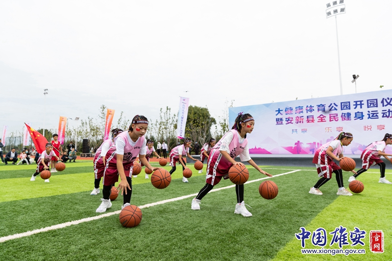 开园仪式现场,雄安新区安新县沈南小学的孩子们伴着青春活力的音乐表演花式篮球操。中国雄安官网高盟 摄